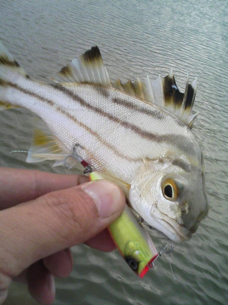 その後、港近くにポイントを移動し、エバポッパーでテトラの周りを探っていると待望のアタリが。続いて沖で水面がワラワラしてたので投げてみたら2本目をキャッチ。その後ワームに変更して、ウツボをサイトで狙ってみるも相手にされず終了。